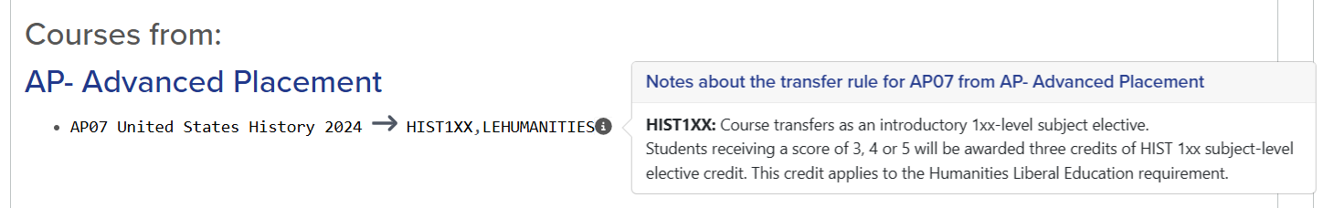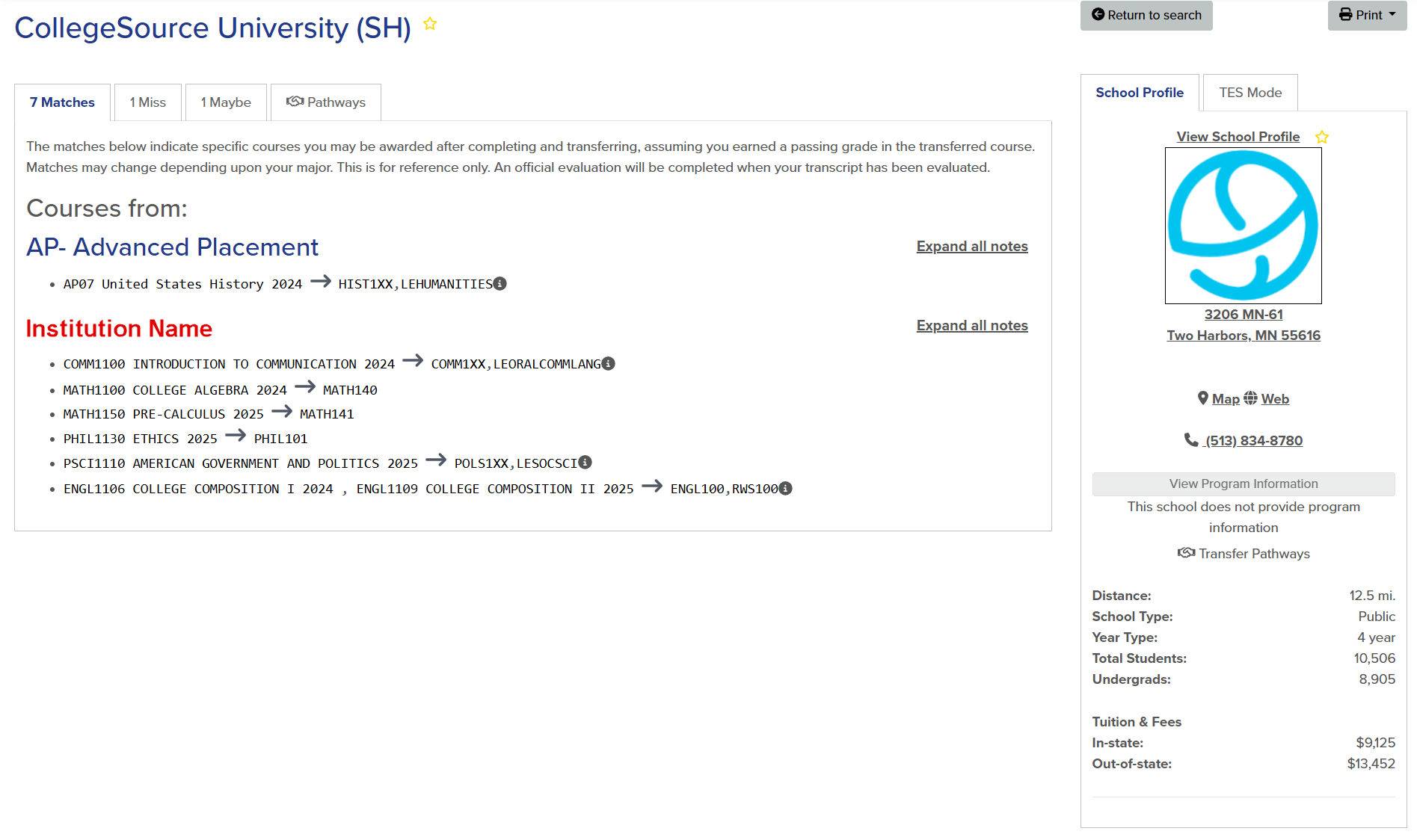 | Matches | Courses, exams, and military credits on this tab have been evaluated by the school as transferring to or earning credit at the institution (assuming they are completed with passing grades). |