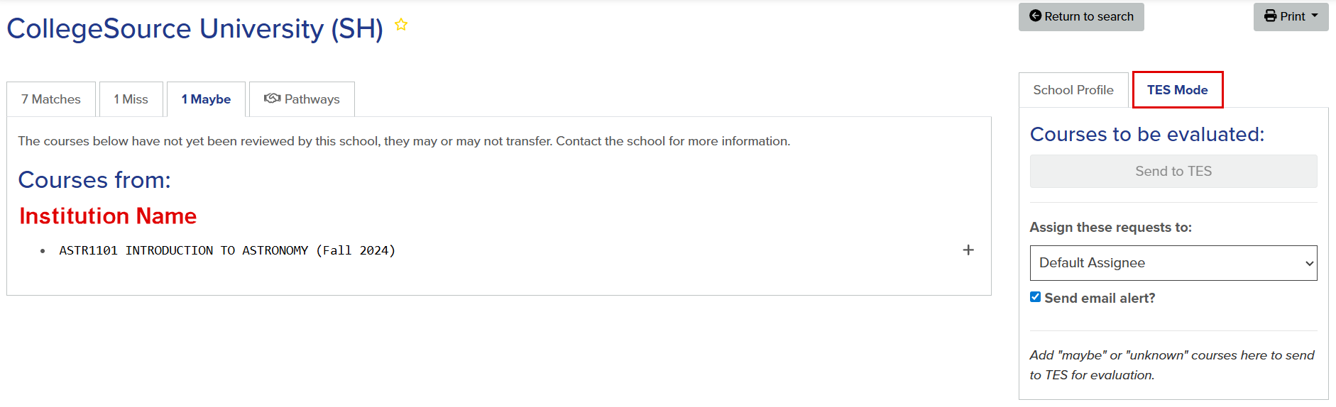 Colleges with a TES® subscription can use the TES Mode feature within Transferology® Lab to send courses from the Maybes tab for review in TES, without having to leave the Lab. See TES Mode: Create Evaluation Tasks from the Transferology Lab under Related Articles for more information.