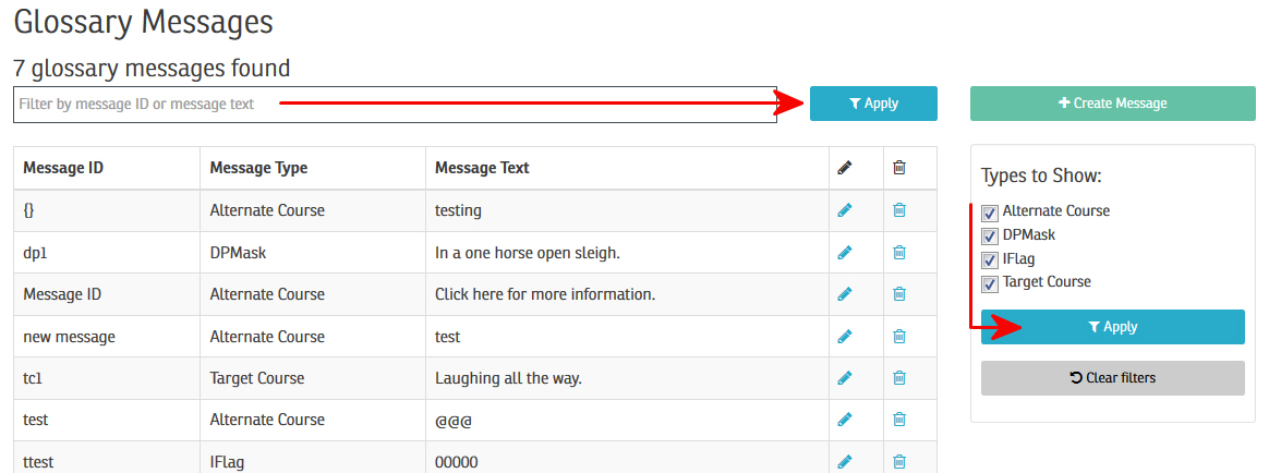 Where Target Course (contains) appears, this means Transferology is applying the Glossary Message to any Target Course that contains the Message ID. Where Target Course (equals) appears, Transferology is applying the Glossary Message to any Target Course that exactly matches the Message ID. |