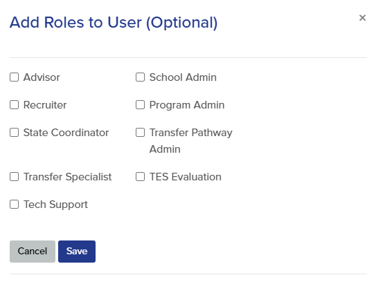 - Select from Advisor, Recruiter, State Coordinator, Transfer Specialist, Tech Support, School Admin, Program Admin, Transfer Pathway Admin, and TES Evaluation.