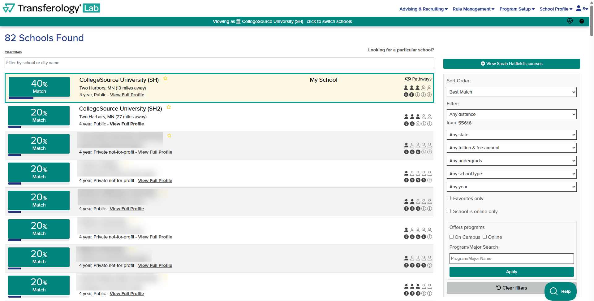 Select View Matches to see the student's Match results. The Transferology® Lab user's college will appear at the top (My School).
