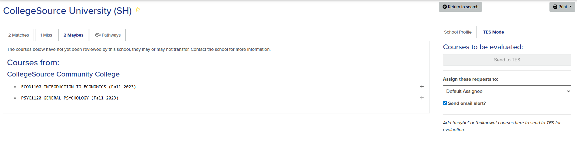 When students reach out to a school through Request Information, it is often because there is an interest in having courses evaluated for transfer. Institutions with a TES® subscription can use the TES Mode feature within Transferology® Lab to send courses from the Maybes tab for review in TES without leaving the Lab. See TES Mode: Create Evaluation Tasks from the Transferology Lab (under Related Articles) for more information.
