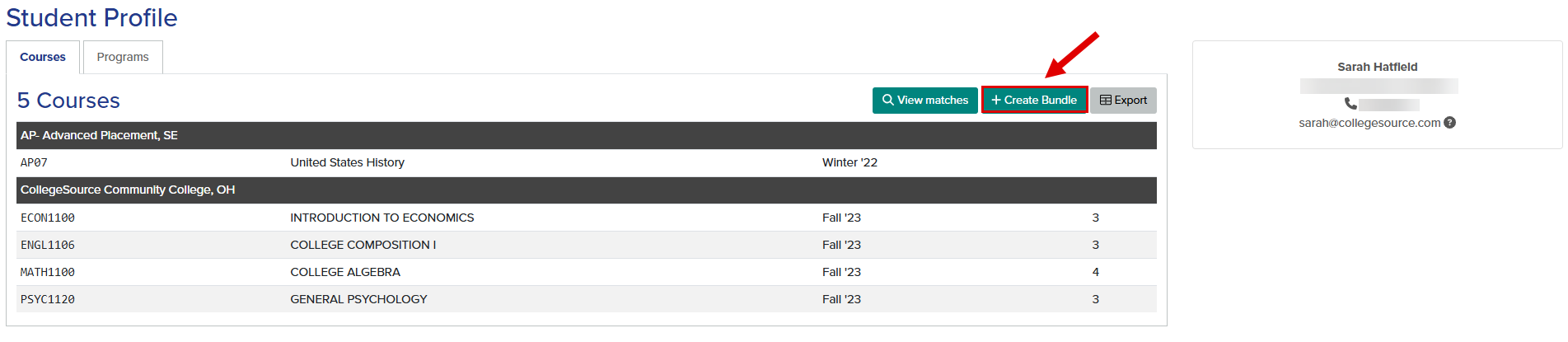 To create a Course Bundle from the Student Profile, select + Create Bundle. This course grouping will be available within Course Bundles within the Advising & Recruiting menu.