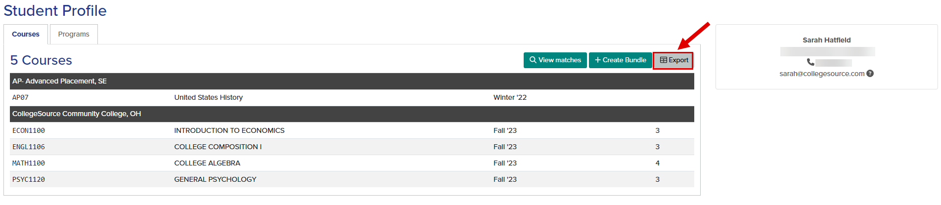 The courses, standardized exams, and military credits the student entered into Transferology are available to the school within the Student Profile page, which is accessible via a Name hyperlink within Recruit Students and Advise Students. Programs run by the student (all or only those run at the school being contacted - depending on student election) are also available within the Student Profile.