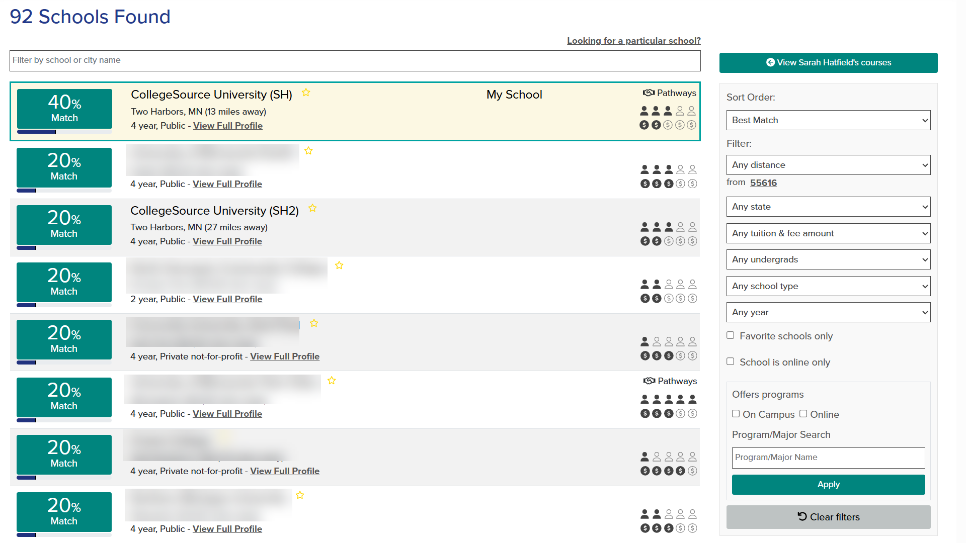 Select the % Match next to the school name to view the Match results: